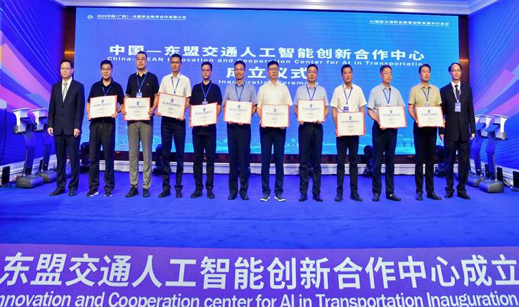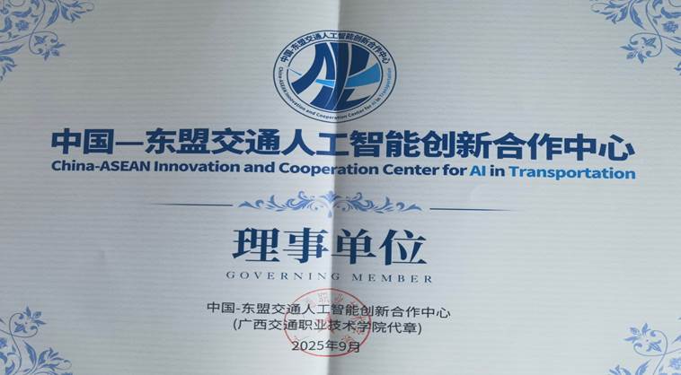 9月16日上午,在2025中国(广西)东盟职业教育合作发展大会—AI赋能交通职业教育创新发展平行会议上,“中国—东盟交通人工智能创新合作中心”(以下简称中心) 正式揭牌成立。该中心的成立标志着中国与东盟在智能交通领域的国际合作迈入实质性新阶段。学院当选中心理事单位,党委书记苏敬同志应邀出席会议,见证中心成立并代表学院接过理事单位牌匾。